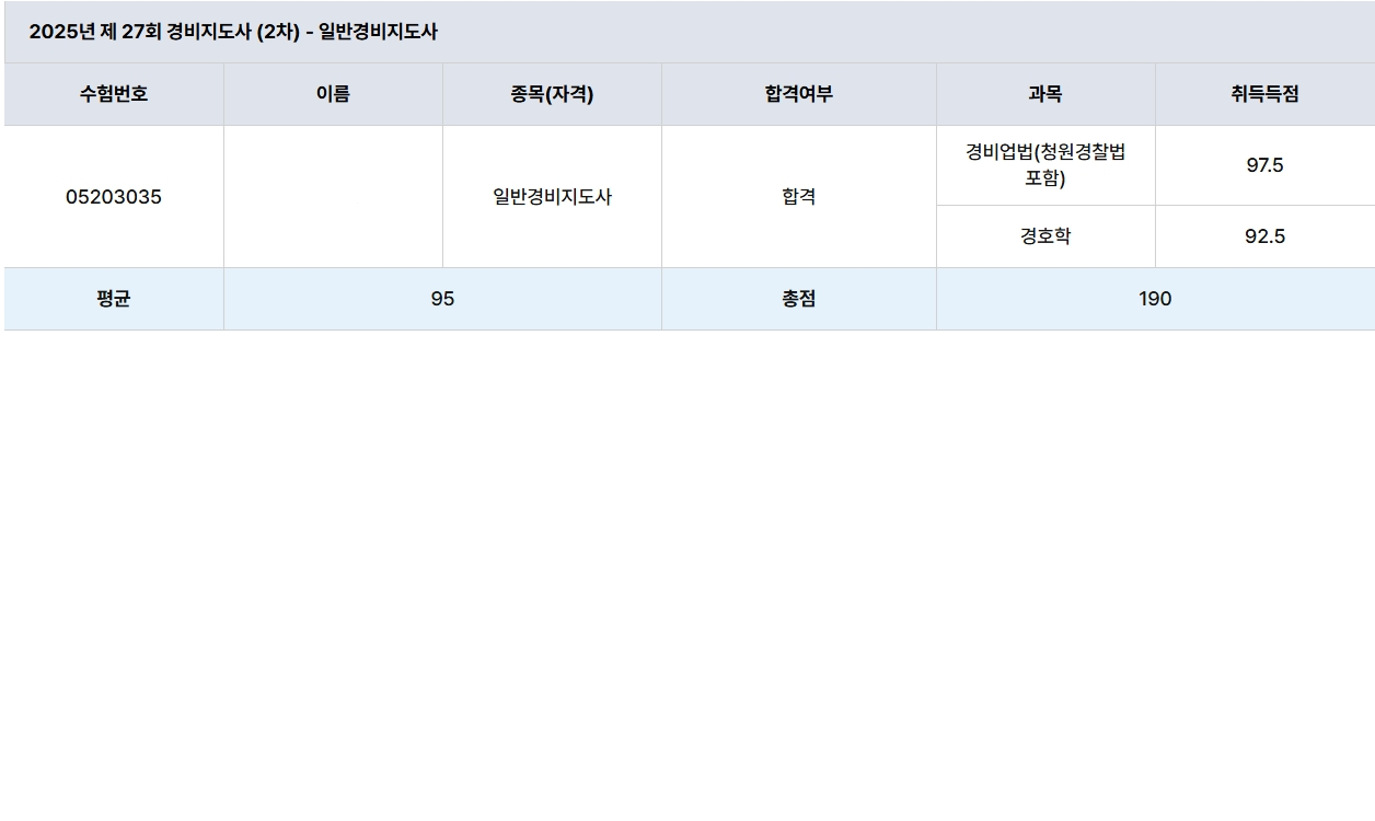 그 결과 경비업법(청원경찰법 포함) 97.5점 / 경호학 92.5점 이라는 성적으로 총점 190점, 평균 95점으로 합격할 수 있었습니다.