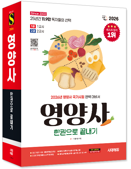 25년간 11.9만 독자가 선택한 베스트셀러 1위, 영양사 국가시험 합격을 위한 필수 수험서! 수많은 수험생이 시대에듀를 선택하는 이유, 지금부터 확인해 보세요.