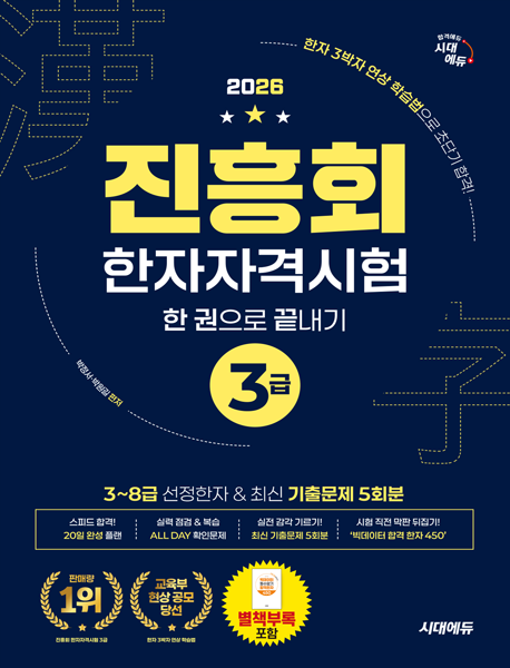 교육부 현상 공모 당선! 박원길 저자의 읽기만 해도 저절로 외워지는 ‘한자 3박자 연상 학습법’으로 진흥회 한자자격시험 3급에 빠르고 쉽게 합격할 수 있도록 구성하였습니다.