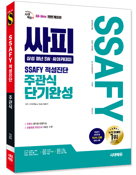 이에 시대에듀는 SSAFY에 입과하고자 하는 수험생을 위해 적성진단 주관식 최신 기출 유형으로 구성한 『시대에듀 All-New 싸피 SSAFY(삼성 청년 SW·AI아카데미) 적성진단 주관식 단기완성』을 출간하였다. 주관식 영역별 대표유형과 유형학습을 수록하고 상세한 해설로 비전공자도 체계적으로 학습할 수 있도록 하였으며, 객관식 온라인 모의고사를 무료로 응시할 수 있는 쿠폰을 제공하여 적성진단 문제 유형에 대한 연습과 함께 자신의 실력을 최종 점검할 수 있도록 하였다.