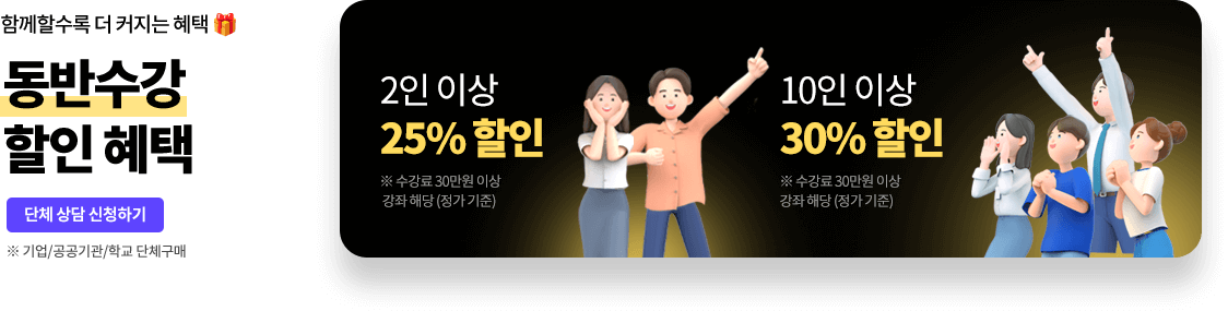 2. 2인 이상 일괄 수강 시 25%, 10인 이상 일괄 수강 시 30% 할인이 적용됩니다.